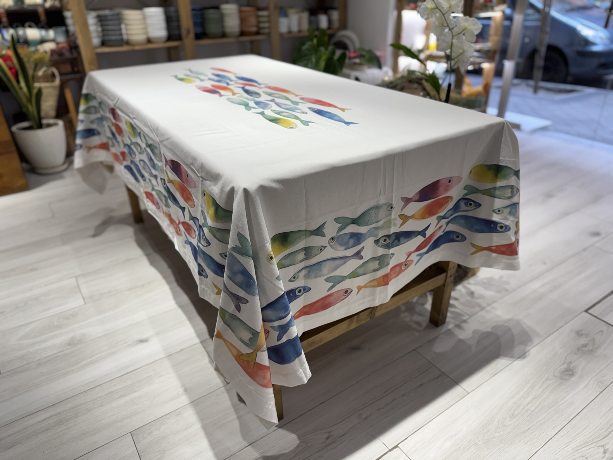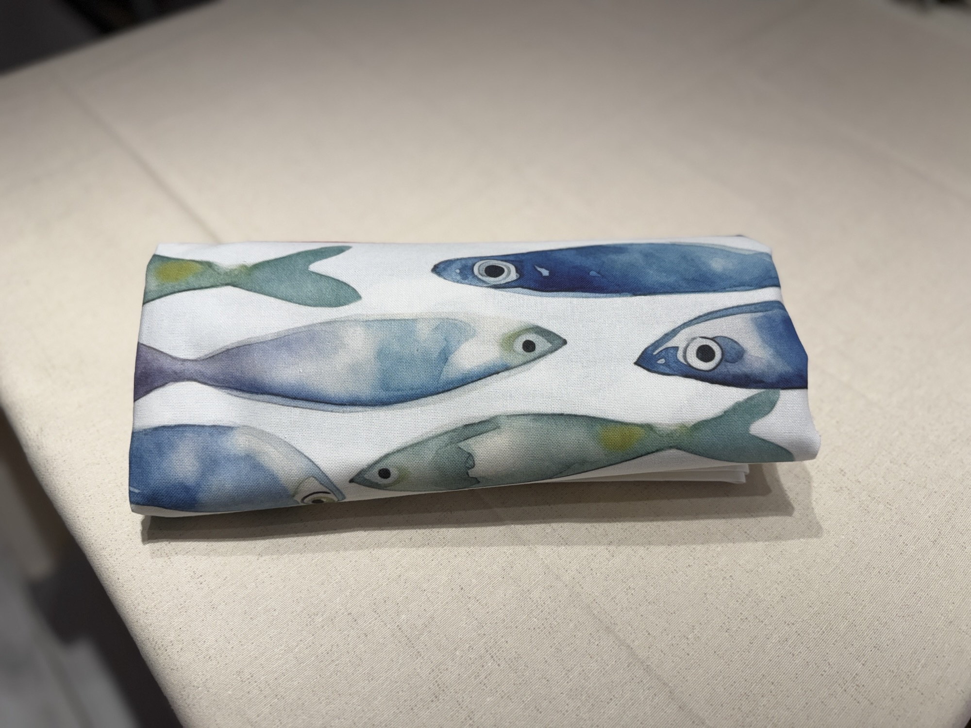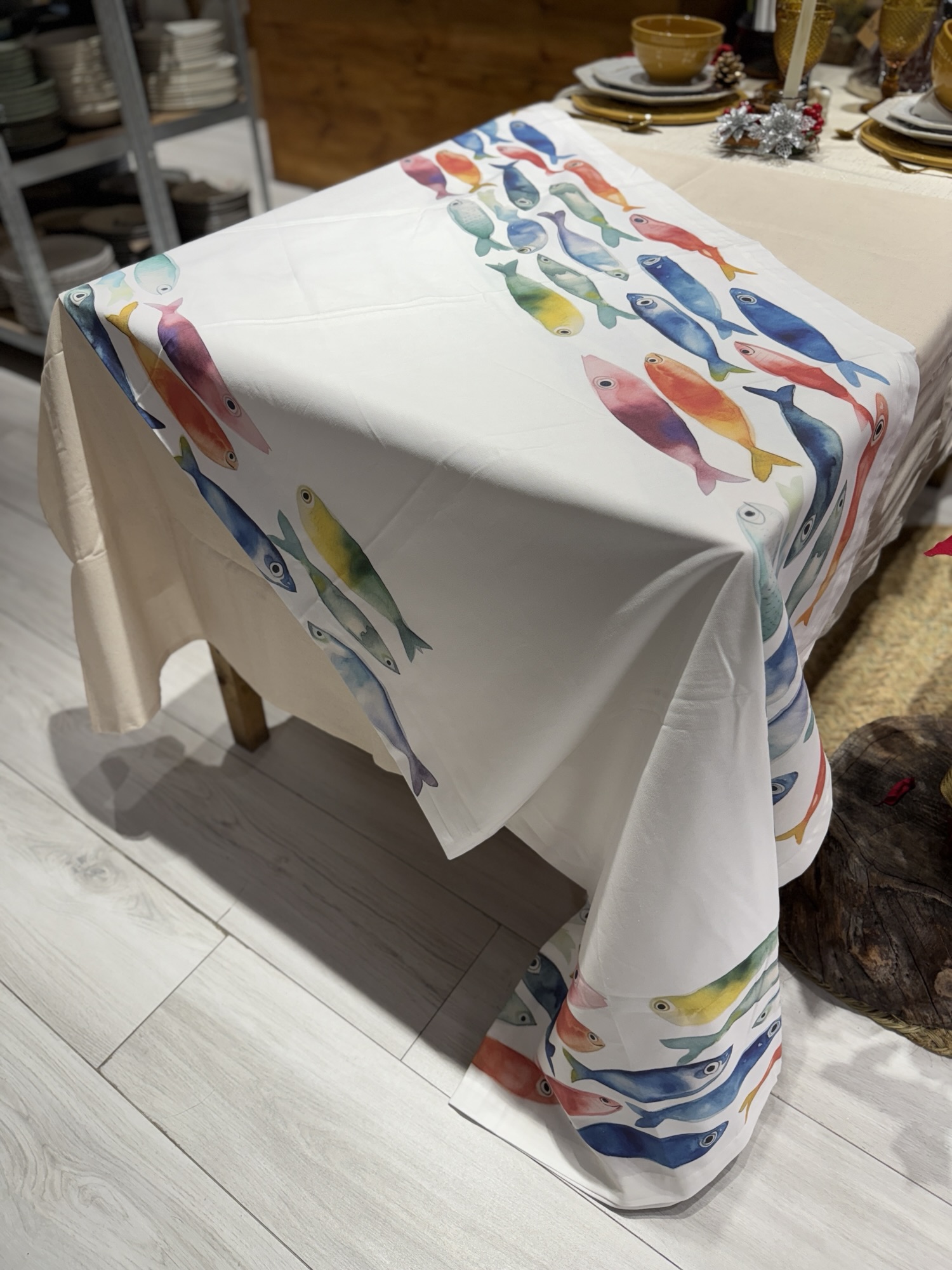 Mantel con estampado de peces multicolor sobre fondo blanco